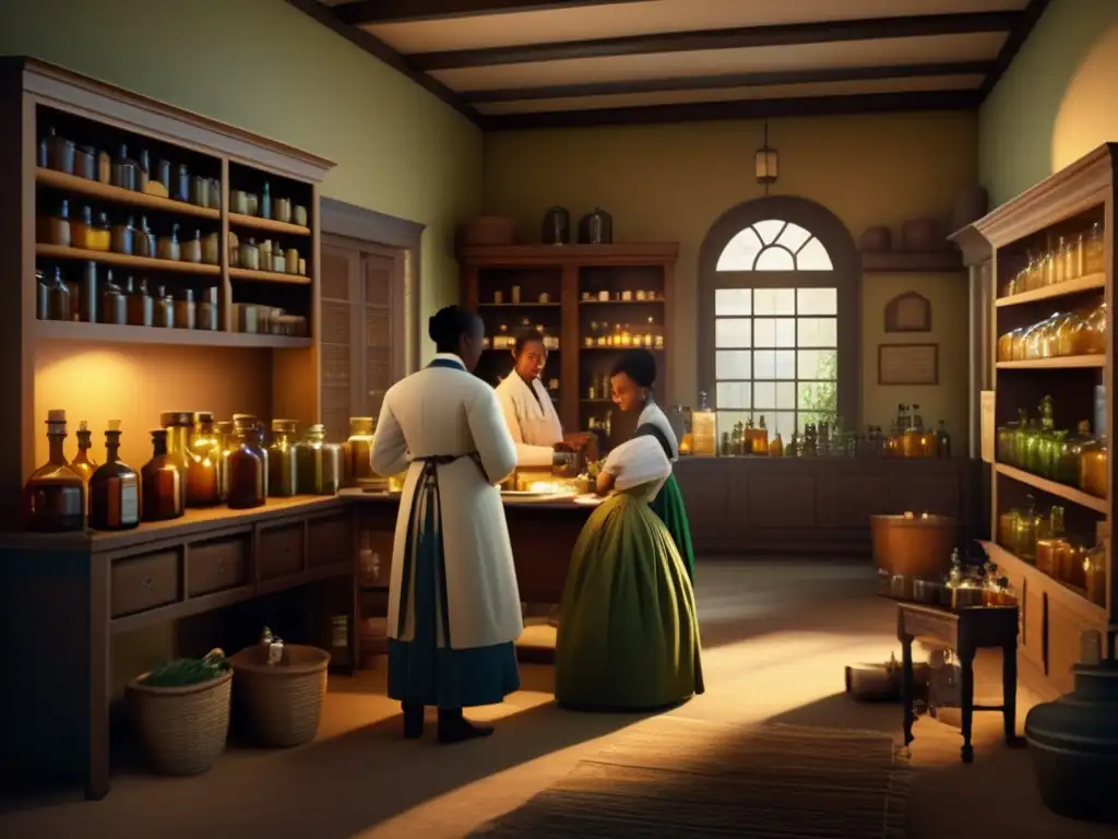 En la penumbra de una antigua botica colonial, un médico barbado prepara un tinte mientras pacientes curiosos observan